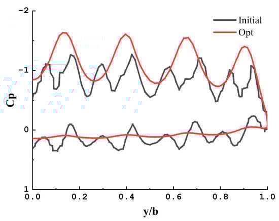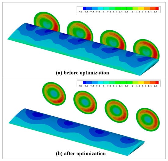 Figure 17 presents a comparison of spanwise pressure coefficients at a quarter-chord position of the wing, both before and after the optimization of the distributed propeller layout. Here, “b” on the X-axis denotes the wing span. Before optimization, eight negative pressure peaks are observed on the upper surface of the wing, with a corresponding number of positive peaks on the lower surface. The area around 0.6–0.7 r, on both sides of each propeller, exhibits the maximum negative pressure. This observation suggests that the axial-induced velocity at the propeller disk’s rear alters with the radial direction. It is at its largest in the 0.6–0.7 r range, while the velocity on either side is considerably smaller. After optimization, the upper surface of the wing displays four negative pressure peaks, whereas the lower surface shows no negative pressure peaks. There is an increase in the upper surface’s negative pressure along the spanwise direction. This implies that the slipstream impacts the entire wing’s spanwise direction. As the propeller’s relative height increases, the primary area through which the propeller disk’s slipstream passes moves to the wing’s upper surface, accelerating the airflow in that region and creating a larger negative pressure area. The slipstream’s effect on the wing’s lower surface is minimal, resulting in no significant change in its pressure coefficient.