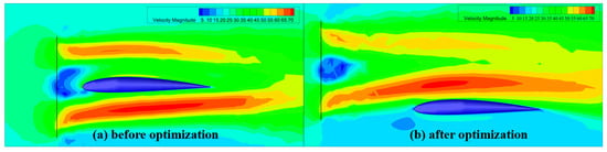 From an aerodynamic standpoint, as indicated in Table 8, the optimized wing demonstrates significant improvements. Following the optimization process, the wing’s lift coefficient experiences a substantial increase of 30.97%, while the lift/drag ratio improves by 7.34%. These enhancements enhance the UAV’s low-speed performance during take-off and extend its cruising time during the cruise phase. Figure 16 illustrates that the axial velocity at the rear of the disk reaches approximately 70 m/s. The alteration in the propeller’s relative height amplifies the pressure disparity between the wing’s upper and lower surfaces, resulting in a larger lift coefficient. Although this also leads to increased drag, positioning the propellers closer to the wing tip mitigates the formation of tip vortices, thereby augmenting the wing’s lift/drag ratio.