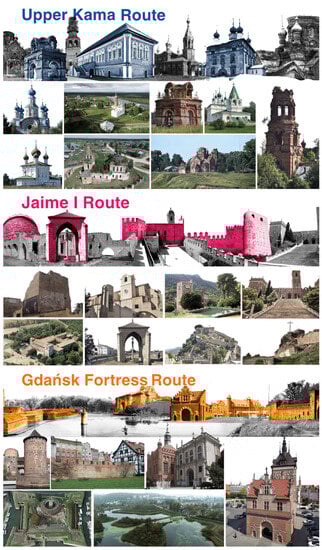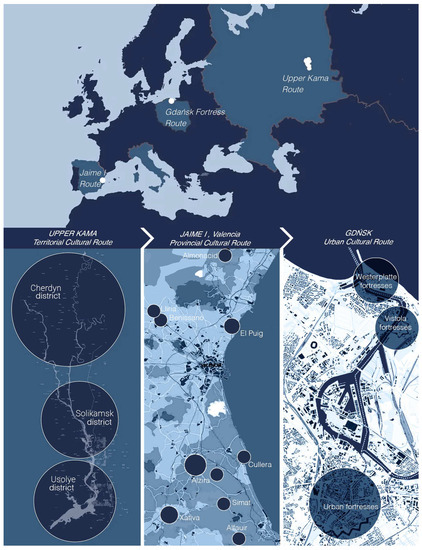 The application was undertaken on some European contexts—identified in the project partner universities—which are heterogeneous in terms of the type of Cultural Heritage routes and investigated at different scales. These contexts included the widespread heritage of Upper Kama (Russia) at territorial scale, the Jaime I sites (Spain) at the provincial scale, and the fortification system of the city of Gdańsk (Poland) at the urban scale [9] (Figure 2).