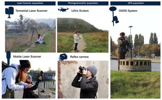 Several tools were employed to produce a digital reference archive of the city and its historical–architectural image. Aiming to define repeatable acquisition protocols for the development of 3D models of the built heritage, all the case studies included the testing of expeditious documentation methodologies. These actions included the joint application of image-based and range-based instruments whose data, suitably integrated, contributed to the production of three-dimensional multi-scalar databases [21], from which it was possible to understand and interpret the digitized cultural route: from the building to the territory and from the territory to the building. An integrated survey methodology was adopted, utilizing terrestrial laser scanners (TLS), mobile laser scanners (MLS), and terrestrial and aerial photogrammetry (UAV). This strategy ensured the acquisition of accurate spatial data and photographic information, which was crucial for structuring and validating the geometric database [22] (Figure 4).