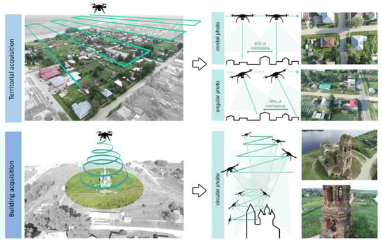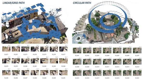 The use of drones was crucial to acquire data from inaccessible areas or architectural surfaces (high heights of some vertical elements, interdicted areas that are not visible from the driveways or pedestrian streets roads, the presence of construction sites or debris in the proximity of some monuments, etc.) and ensure uniformity in describing each analyzed complex. The georeferenced database of the route obtained by drone in some cases enabled the georeferencing of individual architectural databases obtained with LIDAR instruments. For this reason, the drone was used at an altitude 30 to 60 m maximum above the ground that ensured a high level of resolution of the acquired images (designed GSD of 1–2 cm/pixel maximum) (Figure 6).