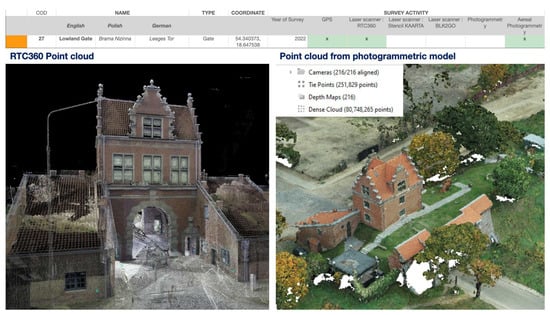 Integrated data acquisition of Lowland Gate (Gdańsk). On the left, Laser Scanner RTC360 point cloud; on the right, point cloud from UAV DJI Phantom RTK.