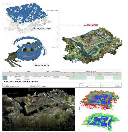 Data acquisition of Vistola Fortress (Gdańsk). Above, UAV data integration of linear and circular path acquisition; below, data integration between MLS, TLS, and UAVs.