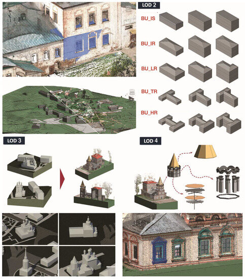 - For the Upper Kama project, the three districts that comprise the various analyzed sites will be represented by a platform integrating GIS and BIM systems. The inserted models of monuments and their context (LOD 0 and LOD 1) will be associated with different information (texts related to the toponymy of historical centers and historical and current images), accessible through specific choices in a menu within the developed platform. From here, it will be possible to access a higher level of detail (LOD 2), which will feature interactive elements describing the monumental system of various buildings and their relationships with the context. Clicking on each of these buildings will delve into the detailed BIM of the individual church or monument (LOD 3), from which one can access specific information about the building.