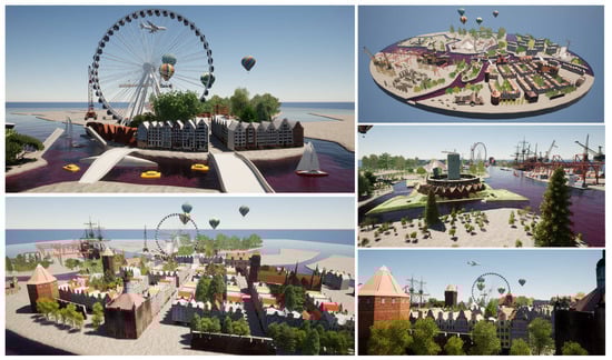 - For the route of the fortifications in the center of Gdańsk, an idealized platform of the city has been designed, where distances and dimensions of various elements have been rethought in relation to their perception within the urban complex. Houses, streets, and minor urban features have been simplified and placed with variable dimensions based on their perceived significance. Similarly, fortified elements have been modeled based on conducted surveys and proportionally inserted with larger dimensions compared with other elements on the platform. Structured on Unreal Engine 4, the platform aims to emphasize the defensive system of the Polish route. It becomes clickable, enabling access to detailed models of each fortified element. These models have been obtained through mathematical NURBS modeling processes, as well as mesh or parametric modeling for some of the most representative buildings (Figure 13).