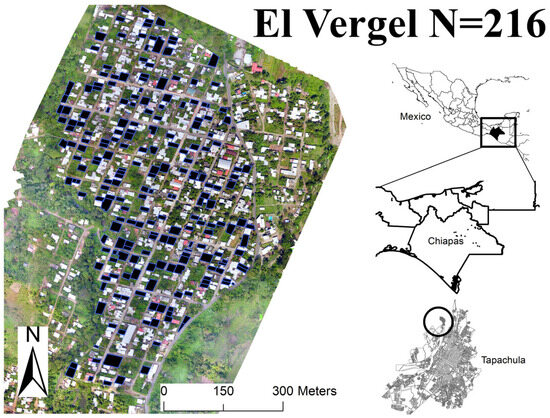 The city of Tapachula is one of the eight socioeconomic provinces of the state of Chiapas, has 353,706 inhabitants, and is located on the southern pacific coast of Mexico. The altitude ranges from sea level to 2600 m, and its ecosystems are cattail marshes, palm groves, and mangroves near the coast, temperate rainforest, and low- and medium-growth rainforest near Sierra Madre de Chiapas [10]. It is an important coffee and cocoa growing area, and the coastal plain has several orchards and other cultivars. Based on the National Institute of Statistics and Geography [10], the average annual temperature of the city is about 21.7 °C with rainfall of 1000–5000 mm. The climate is warm/humid temperate with a heavy rainy season from May to November [10]. Three main rivers cross the city: Texcuyuapán, Coatán, and Manga de Clavo. El Vergel is a neighborhood in the Northwest of Tapachula, Chiapas with an area of 433 km2 and an estimated population of 2590 people in 592 regions of interest (Figure 1).