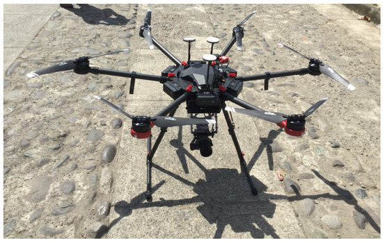 This research used a hexacopter UAV model, Matrice 600 DJI (DJI® Austin, TX, USA), a multirotor UAV with six rotors (Figure 2). The air vehicle included a gimbal for mounting a ZenmuseX5 camera [23] (DJI® Austin, TX, USA). Independently, a multispectral camera, MicaSense RedEdge-MX [24], with an RGB sensor and four spectral bands was also placed, considering the range: green (G, 530–570 nm), red (R, 640–680 nm), red edge (RE, 730–740 nm), and near infrared (NIR, 770–810 nm) (AgEagle Aerial Systems Inc.®, Wichita, KS, USA). Thus, it was possible to obtain shots from both cameras in a single flight, which reduced work time in the field.