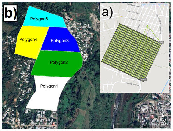 Flight drone organization in the El Vergel neighborhood, Tapachula, Chiapas, Mexico: (a) drone flight route to obtain aerial photographs and (b) drone flight polygons in the community.