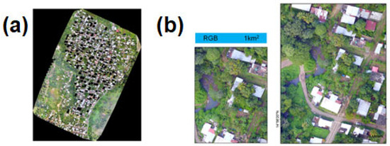 Orthomosaic of the El Vergel neighborhood, Tapachula, Chiapas: (a) orthomosaic; (b) details of the orthomosaic. The dark squares are the houses that were surveyed.