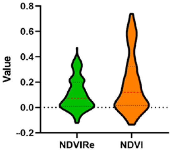 - Normalized Difference Vegetation Index RedEdge (NDVIRe). This spectral index is constructed as a mixture of NIR bands and a band using a narrow spectral range between visible red and NIR. It is more sensitive than NDVI during a certain period of crop maturation. It is more valuable than NDVI for intensive use throughout the growing season, as NDVI often becomes inaccurate when plants accumulate the maximum possible amount of chlorophyll. Equation: [33,34].