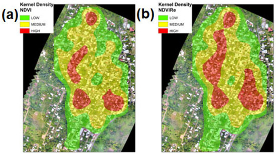 Kernel density maps for the vegetation indexes in the El Vergel neighborhood, Tapachula, Chiapas: (a) kernel density of NDVI and (b) kernel density of NDVIRe.