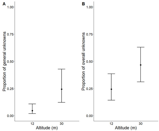 Most detected birds were identified to species or guild, but general unknowns were common, especially at the 30 m altitude. The sum of the six guild unknown categories and 1 general unknown category constituted 74 (30.2%) of 245 total detections at the 12 m altitude and 120 (58.8%) of 204 total detections at the 30 m altitude. Flight altitude significantly impacted the proportion of birds detected during a transect that were classified into the general unknown category (guild and species unknown;