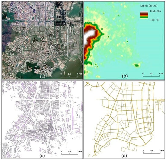 Basic GIS data of the study area: (a) image; (b) DEM (Different colors represent different elevations, refer to the ribbon label); (c) building; (d) road.