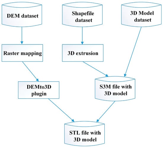 Except for the DEM data stored in the raster image format, mapped by the 2D grayscale symbology, most of the basic GIS data are vector boundary information stored in the shapefile (.shp) file or json file format. A few, such as oblique photographic models and laser point cloud data, are directly stored in 3D data format. Before 3D printing, it is necessary to unify the format into the stereolithography file (STL).