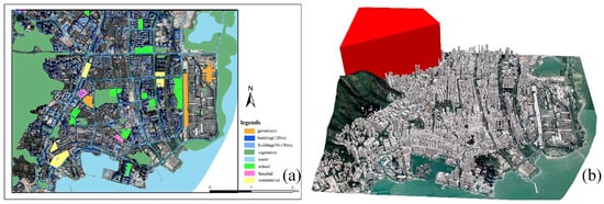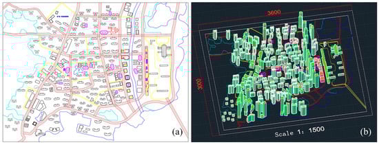 The CAD data: (a) 2D CAD: The red lines represent the road, the black lines represent the buildings, and the other color represent the extent of other elements; (b) 3D CAD: The green represent 3D building and the pink represent the lower buildings.