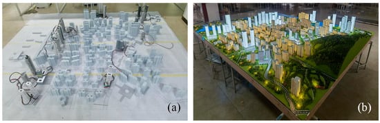 (1) The basic geographic information data of the study area are used to obtain the geographical constraint elements that affect air route planning, such as buildings, roads, and water bodies, restore the geometric shape, texture and color of the elements in the scene in proportion through 3D-printing technology, and establish a physical sandbox model of the study area. As shown in the red block in Figure 1; see Section 3.2 for specific methods.