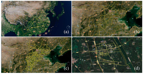 A multi-level Skyroad network indicated by yellow line: (a) backbone air-routes (country level); (b) trunk air-routes (province level); (c) branch level air-routes (city level); (d) terminal level air-routes (region level) [39].