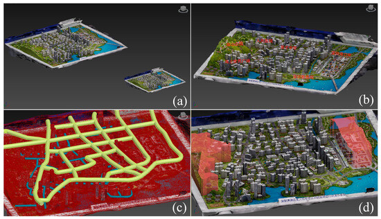 Modeling of virtual Skyroad scene: (a) virtual sandbox scale transformation; (b) POI modeling: the red texts indicate POIs information; (c) Skyroad modeling: Red indicates low-altitude geography, yellow lines are higher altitude air routes, and blue lines are lower altitude air routes; (d) geofence modeling: Red geo-fences are areas where drone flights are restricted or prohibited.