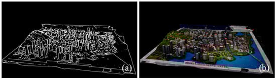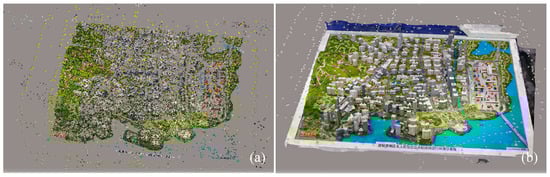 The multi-view images are collected by shooting around the sandbox with the camera, and the feature points of each image are extracted using the scale-invariant feature transformation (SIFT) operator. Sparse point-line feature-matching is employed to calculate the internal and external orientation elements, and they are optimized using bundle adjustment. The 3D point cloud of the target is acquired based on dense matching, and finally a 3D model is generated through triangulation and texture mapping. We add real scale constraints in the reconstruction process so that the ratio of the reconstructed virtual sandbox to the real physical sandbox is 1:1, which is used as the scale benchmark of the virtual Skyroad scene to achieve virtual-real scale matching. The sandbox 3D reconstruction is shown in Figure 9.