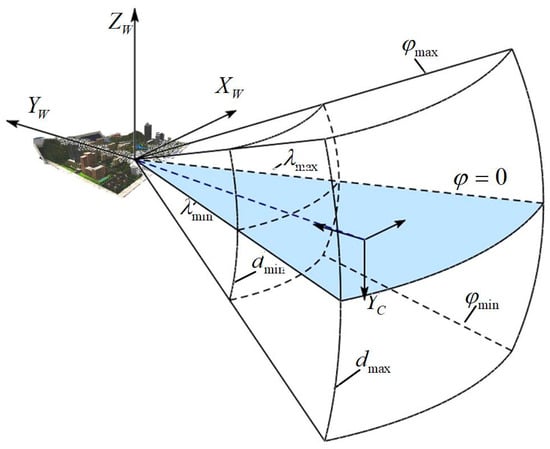 Assume that the virtual sandbox is located at the center of the spherical coordinate system formed by the camera orbit motion, and the optical axis of the camera always passes through the center. By specifying the interval of longitude , latitude and distance in the spherical parameters, the viewing range covered by the camera under different view angles and different distances is limited to a certain spherical hexahedron, as shown in Figure 10.