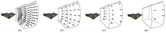 We draw on the approach of hierarchical tree proposed by Wiedemann [42]; the views are roughly sampled at higher image pyramid levels to speed up recognition in the online stage. View sampling starts from the lowest image pyramid level, and calculates the similarity between views at adjacent camera positions by applying a contour similarity measurement (Formula (5)). The pair of views with the highest similarity is merged into a new view, and the similarity between its neighbors is calculated. This process is repeated until the similarity is below a certain threshold. As shown in Figure 11a, the views remaining after merging are stored at the lowest (original) hierarchical level. In order to derive the view of the next higher hierarchical level, the similarity constraint is relaxed by reducing the image resolution while continuing to merge according to the similarity measure, as shown in Figure 11b–d. The subviews are views of the lower pyramid level that have been merged to obtain views at the current pyramid level or that cannot be merged. Each view stores references to all subviews via a hierarchical tree structure. This information is used during the online phase to query a given view at a higher pyramid level, and at the lower pyramid level to refine the match.