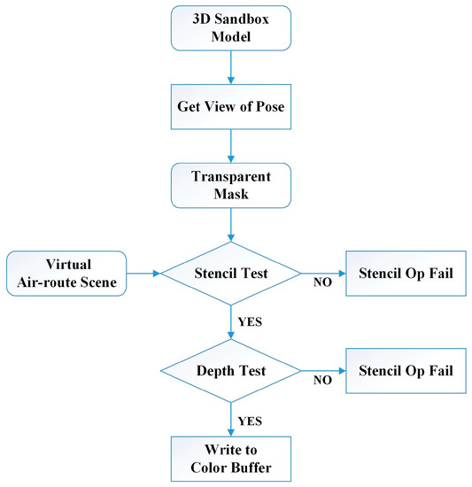 After determining the spatial relationship between the camera and the sandbox, it is necessary to superimpose the created virtual Skyroad scene on the physical sandbox, and in order to render the virtual scene more realistically, it is necessary to obtain the correct occlusion relationship between them. The virtual sandbox model can be used to obtain the depth information of the physical sandbox in the scene and realize the virtual-real occlusion handling through the template test and depth test of the GPU graphics rendering pipeline. The specific process is shown in Figure 13.