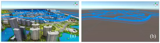 (2) Based on geographic information data, multi-level air-route planning (backbone, trunk, branch, terminal) [38] and the iterative construction of an air route network in the urbanization region [39] are executed. The generated waypoint data are imported into the 3D animation software in a specific file exchange format to create a multi-scene and multi-level virtual animation scene for UAVs’ low-altitude public air routes. This is shown in the blue block in Figure 1; see Section 3.3 for specific methods.