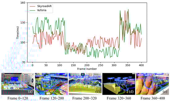 The method described in this paper can be compared with the model target module in the commercial software Vuforia. The same mobile device is used to record the time consumed by pose estimation of each frame through a camera video at different view angles, different distances, and different scales, as shown below in Figure 17. The tracking registration from the center of the sandbox (frame 0–120) is initialized, and moved smoothly to the right side of the sandbox before zooming the observation distance (frame 120–200), then quickly moving to the left side of the sandbox (frame 200–320), and using the hand for full occlusion (frame 320–360) and for partial occlusion (frame 360–400). The tracking time corresponding to this 400-frame video is shown in the upper part of Figure 17.