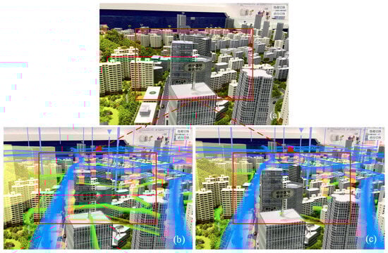 Red boxes and arrows indicate sample occlusion of local scenes. As designed in Figure 8c, the blue lines denote primary urban skyroad with higher altitudes and faster speeds, while the green lines represent secondary skyroad within urban communities with lower altitudes and slower speeds. (a) local view of the physical sandbox; (b) without occlusion handling; (c) after occlusion handling.