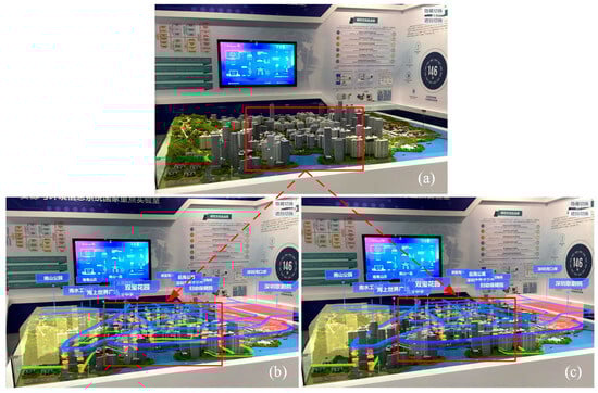 By turning the virtual-real occlusion function in the local and global scene on or off, the AR effect and can be compared and the real-time frame rate recorded to evaluate the efficiency of occlusion, as shown in Figure 18. In the local scene (Figure 18b), since the green Skyroad is not occluded, it is always displayed in front of the building, resulting in incorrect spatial cognition. In Figure 18c, by using the reconstructed sandbox model to compare the depth value of the current position, the green Skyroad behind the building is occluded so as to obtain the correct AR effect.