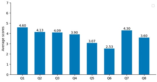 In terms of perceived ease of use, Q5 (T = 0.66, p > 0.05) suggests that users perceive the ease of interaction to be slightly higher than the theoretical average score, with minimal difference. However, Q6 (T = −4.18, p < 0.05) indicates that the current software interaction has certain limitations, differing significantly from the assumption, and users desire more interactive functions. This is because the primary objective of SkyroadAR is to visualize the operating concept of UAVs’ low-altitude public air route. Due to the substantial difference between mobile device operation and traditional keyboard-mouse interaction, desired interactive functions like a precise interactive air-route design module have not been developed. Q7 (T = 16.86, p < 0.05) and Q8 (T = 4.32, p < 0.05) indicate user affirmation regarding the useful role of SkyroadAR in the forward-looking research and development of Skyroad. Both professional and non-professional users find this valuable for UAV regulation in this innovative approach.