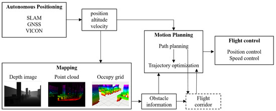 The framework of UAV autonomous obstacle avoidance system includes autonomous positioning, perceptual mapping, motion planning, and flight control, while the flight corridor takes map and path as input, and acts in trajectory optimization.
