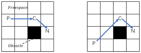If a neighboring node of a node C contains an obstacle, define N (Neighbor) to be a neighboring node of C (Current) and P (Parent) to be the parent of C. N is said to be a forced neighbor of C if the distance cost of P to reach N via C is less than the distance cost of either path to N without going through C. Figure 2 shows the forced neighbors for linear as well as diagonal motion, respectively.