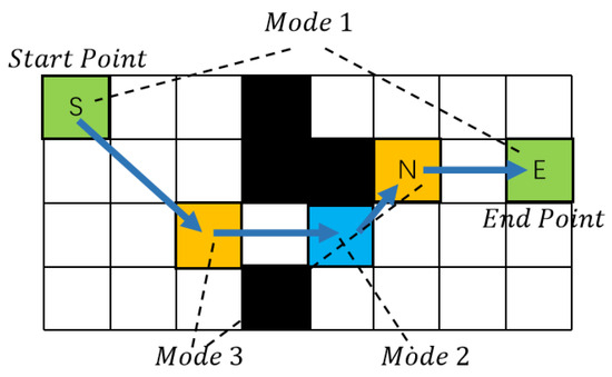 where denotes the cost of moving from the starting point to the point to be examined and denotes the predicted cost from the point to be examined to the target point. The for a body raster that is at the same height as the current raster. For rasters at different heights from the current raster, , as shown in Figure 4.
