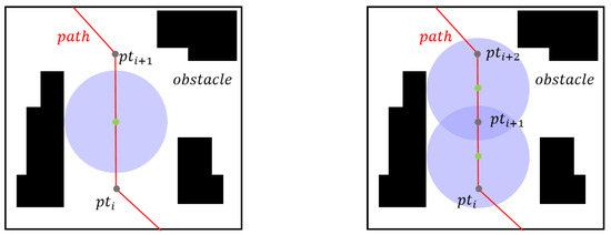 In order to make the corridor satisfy the continuity condition, Ref. [11] initializes an ellipsoid containing the two endpoints of the path for expansion, and then continuously iterates over the two parameters of the ellipsoid’s long and short semi-axes. Unlike theirs, our method only needs to iterate one parameter, the radius r of the sphere, then check whether the continuity Formula (5) is satisfied and ensure that all points within the vector are contained within the continuum space of the corridor by inserting intermediate points as shown in Figure 5. The insertion point operation is hardly used in most cases in the experiments.