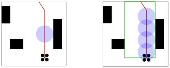 Since the radius of the ball needs to be calculated several times in the above process, this paper adopts the method in [11] and sets a bounding box to limit the maximum expansion space in the process of finding the ball, in order to reduce the computation time and avoid corridor space search in regions that are too far away. There is also a perceptual boundary for the sensors in the actual flight. The bounding box consists of a cube and its axes are aligned with the path of the corresponding path segment. The minimum distance from each face on the cube to the path segment is . Assuming that the maximum velocity and maximum acceleration of the UAV are and , respectively, the distance of the bounding box should satisfy . The bounding box is set as shown in Figure 9.