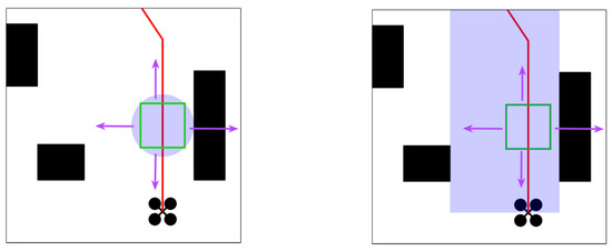 Ref. [13] constructs spherical flight corridors, which are constructed in a map data structure based on a KD tree representation. As the safe radius of any point in the map can be found by the fast nearest neighbor search method in the KD tree, the distance from the coordinate point to the nearest obstacle can be easily obtained, and the distance is used as the radius of the spherical corridor. A random sampling-based method is used to connect the path from the starting point to the target point, and the points on that path are used to construct a continuous spherical corridor. Ref. [14] further improves on NanoMap [15] by iteratively checking whether the query point is in the in-frame view in order to obtain the distance from the nearest point to the drone, and estimating the uncertainty of the query. Then, using a KD tree, the nearest neighbor point is found and a spherical corridor is generated along the path. The advantage of a spherical corridor is that it is simple to construct, requiring only one parameter, the safety radius, to be found to construct a sphere. However, spherical corridors are less space efficient and have less free space for path optimization. Ref. [16] builds cubic flight corridors based on octree maps, which have axes parallel to the coordinate axes, and the corridors also expand axially. However, the construction method in [16] is more dependent on the octree map environment, and the space utilization of this type of corridor is low due to the geometric properties of the octree structure itself in space. Ref. [17] proposes a cube corridor construction method that finds the maximum radius sphere by constructing an ESDF map and then expands the inner cube of this sphere axially, which does not rely on the octree map structure and therefore can contain more free space. The advantage of a cubic corridor is that the space is easy to represent and can be simply parametrized by the intersection of the six surfaces of the corridor space with the corresponding axes, i.e., by restricting the coordinate points to the upper and lower bounds represented by the and z axes. However, in highly non-convex spaces, polyhedra can often contain more free space than axially extended cubes [10].