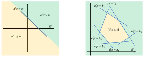 Green and yellow, respectively, represent a half-space, and the intersection of finite half-spaces forms a polyhedron.