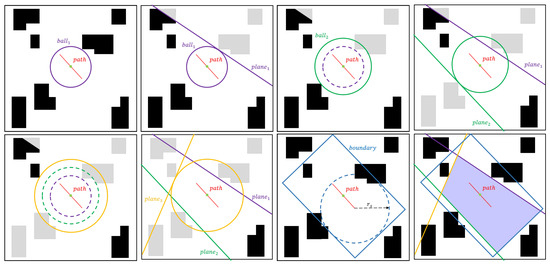 As shown in Figure 9, the distance from the midpoint of the path to the nearest obstacle enables a spherical corridor to be found on the corresponding path segment. Using the contact point between the ball corridor and the obstacle as the tangent point, make a tangent plane tangent to the ball, which separates the ball from a portion of the obstacle. Once this tangent plane is obtained, the obstacles outside the tangent plane are removed to obtain a new radius , a spherical corridor , and a tangent plane , and the above steps are repeated.