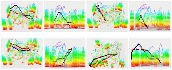 In order to verify that the algorithm limits the variation in 3D height, this paper verifies the effectiveness of the algorithm in different 3D maps, as shown in Figure 10. In the figure, both algorithms have the same start and end points, the paths solved by the algorithm in this paper are shown in red, and the paths solved by the JPS algorithm are shown in black.