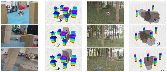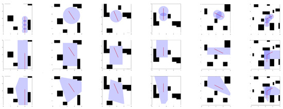 Figure 11 shows the construction results of spherical corridors, cubic corridors, and polyhedral corridors under six different maps (with each column having the same map and path). From the graph, it can intuitively be seen that the spatial occupancy rates of the three corridors are in order: polyhedral corridor>cubic corridor>spherical corridor.