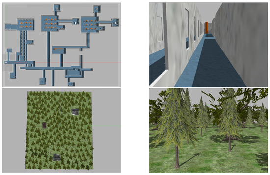 The simulation experiment scenario uses both indoor as well as wooded simulation environments [23], as shown in Figure 13.
