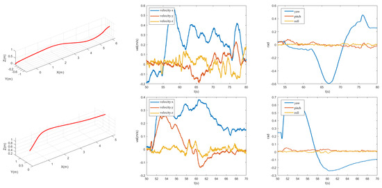 Indoorand outdoor flight test data. The left figure shows the trajectory curve, the center shows the velocity curve, and the right figure shows the attitude angle curve.