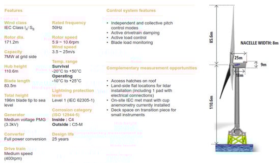 - ORE Catapult. Levenmouth 7MW Demonstration Offshore Wind Turbine. 2018. Available online: https://ore.catapult.org.uk/wp-content/uploads/2018/08/Catapult-Specification-and-Service-Summary-Sheet-Levenmouth-turbine.pdf (accessed on 13 November 2023).