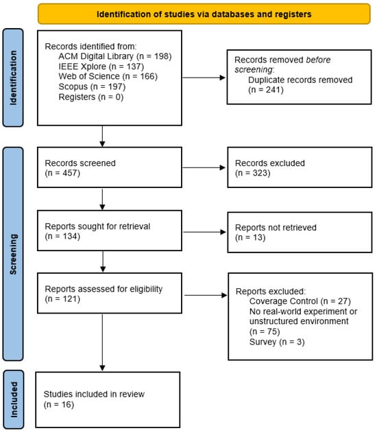 The PRISMA flow chart in Figure 3 shows the number of records identified by the search strategy for each database. Initially, works duplicated across the searches were removed. The screening process was carried out by removing works whose title or abstract made no mention of “Coverage”, “Multi-robot”, or “Multi-agent”. The works were then sought for retrieval and discarded if unavailable or requiring purchase. Finally, the literature exclusion criteria were used to remove irrelevant works.