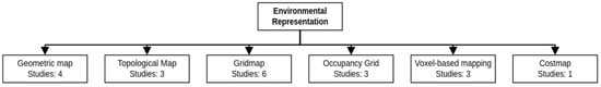 Environmental modelling is concerned with the methods used by robots or a central planner to represent the environment and tasks within it. A taxonomy was constructed to systematically categorise and analyse the approaches featured in the studies as shown in Figure 4. This taxonomy of environmental models includes the following categories: geometric maps, featured in four studies; topological maps, featured in three studies; grid maps, featured in six studies; voxel-based maps, featured in three studies; occupancy grids, featured in three studies; and cost maps, featured in one study.
