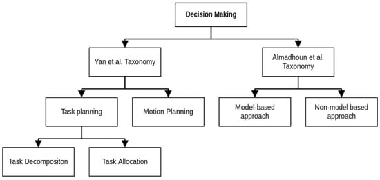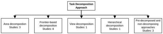Decision making, as per our definition, corresponds to the collective choices defined by specified objectives made by a multi-robot system. The applicable studies were analysed using the model/non-model distinction proposed by Almadhoun et al. [33] and planning definitions posited by Yan et al. [36]. Almadhoun et al. identified a classification of approaches based on their assumed prior knowledge. Model-based approaches involve prior knowledge of the tasks and environmental structure before the coverage task. Non-model-based approaches forgo this assumption and require modelling of the environment during the task. Yan et al. identified three components that compose mobile multi-robot task-planning approaches: task decomposition, task assignment, and motion planning. Figure 5 details the analysed aspects of Decision Making. Task decomposition is not always necessary, depending on the prior knowledge, but refers to the decomposition of a multi-robot task into a set of single-robot tasks. In the case of coverage, task decomposition takes the form of decomposing the environmental representation into robot positions or poses as tasks. A task decomposition taxonomy was formed to analyse the approaches’ suitability for OWT coverage as shown in Figure 6.