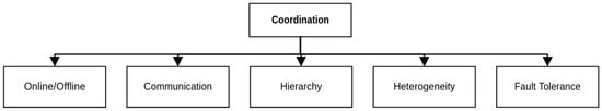 Farinelli et al. [37] consider coordination to be a form of cooperation, where team members consider other team members in their actions to increase system performance. Yan et al. [36] defined coordination as planning to deal with resource conflicts among team members. The aspects considered coordination in this work are aspects related to potential resource and reliability issues that may arise from the use of real robots, communication approaches, team hierarchies, fault tolerance, and robot heterogeneity. Data relating to these aspects of the studies were extracted from the works where approaches were specified. The aspects of Coordination are visualised in Figure 7.