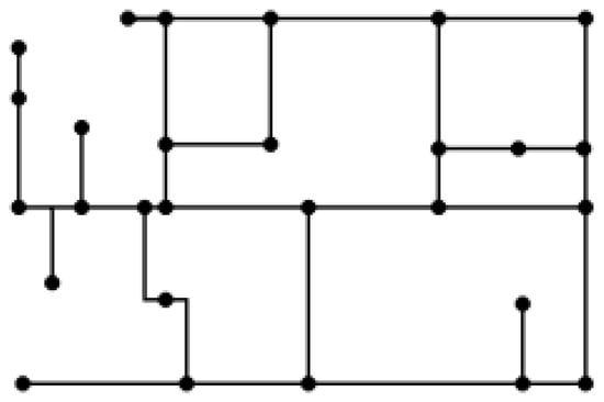 Choset et al. [56] defined topological representations to represent environments with graph-like structures, with the nodes representing “something distinct” and the edges representing the spatial relationship between nodes. The focus of topological maps is how different nodes, representing points of interest in the environment, are connected to each other rather than the detailed geometric properties of the space. As such, these representations are usually in the form of graphs composed of nodes with edges representing the interconnectivity of nodes, an example of which is given in Figure 9. The edges in a topological representation can be assigned semantic properties, such as a cost of traversal or directionality [57]. Topological maps are often contrasted with geometric maps, although geometric maps can be and often are decomposed into topological representations. This was the case in [40,42], the authors of which considered an initial geometric map representation and used boustrophedon cell division, which is described in greater detail in Section 5.2.1. The result of boustrophedon cell divisions is a set of connected cells in the environment that takes the form of a topological representation. An occupancy grid (discussed in Section 4.4) was used by Kim et al. [44] to generate “waypoints” to ensure sensor coverage of the environment. These tasks can then be viewed as nodes in a graph connected by edges. Topological maps are rarely considered a priori knowledge; instead, another representation is decomposed into a topological map, as in [44]. Due to their simplified and abstract nature, they are better-suited to global path planning, with the specifics of path planning abstracted to an edge cost value.