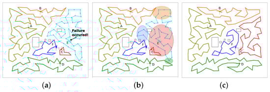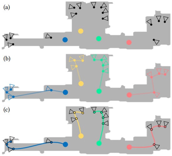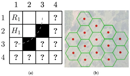 A grid map is a grid of specified dimensions composed of squares of a certain size. Sometimes, the size of the grid cells represents the size of the robot’s footprint or a sensor’s footprint such that visiting each cell would provide full coverage of the environment [45,48,49]. Other times, the grid cell is used to discretise the possible positions [50] or to facilitate allocation of the environment to team members while still requiring a coverage path inside the cell [47]. In contrast to topological maps, with known dimensions and directional relations between cells, grid maps provide an abstracted yet accurate modelling of the environment’s geometry. However, assuming that each cell represents a task, a grid map can be considered both a metric map and a topological graph. Kalde et al. [45] provided an example of encapsulating semantics in their grid map through the use of cell states. This can be seen in Figure 10a. In their work, the cells were in one of four states: unknown cells, denoted by question marks, represent those that have yet to be explored; occupied cells, denoted as black cells, represent static obstacles; animated cells represent robots, e.g., R1, and humans, e.g., H1; and free cells represent explored empty cells, denoted in white. Sharma et al. [48] used a similar representation. The model used in [49] can also be described as a grid map. Perez-imaz et al. [47] made use of a hexagonal grid map rather than a square one. Hexagonal grids facilitate diagonal movement with uniform distance between cells, as well as better approximation of a circular sensor radius than a square, allowing an environment to be represented with fewer cells. A visualisation of the hexagonal grid map used by Perez-imaz et al. is shown in Figure 10b. Song et al. [46] made use of a multi-resolution grid-based environmental model. At the smallest resolution, the cells are the size of the sensor radius, and above that is a map of supercells composed of four cells. This multi-resolution grid is used to facilitate vehicles escaping local minima. While these simple multi-state grids are sufficient for the authors’ uses, they do not take into account sensor uncertainty as per the aforementioned three main challenges [39] and are therefore unsuitable for real-world applications alone. However, such representations are compact and therefore particularly useful for high-level planning.